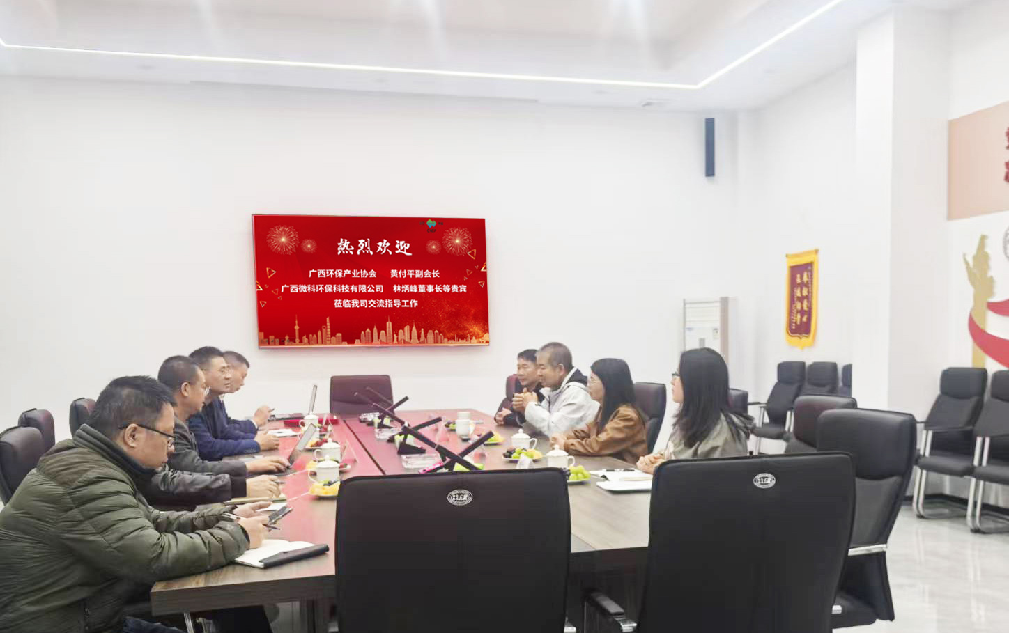 ? ? ? 參觀結(jié)束后,雙方聚焦行業(yè)痛點與發(fā)展機遇,召開專題技術(shù)交流會。邵總首先代表公司對黃付平會長一行的蒞臨表示熱烈歡迎,隨后詳細介紹了川寧環(huán)保核心團隊的構(gòu)成、專業(yè)背景及多年來在環(huán)保領(lǐng)域的深耕成果,讓貴賓們進一步了解公司的人才優(yōu)勢與發(fā)展底蘊。