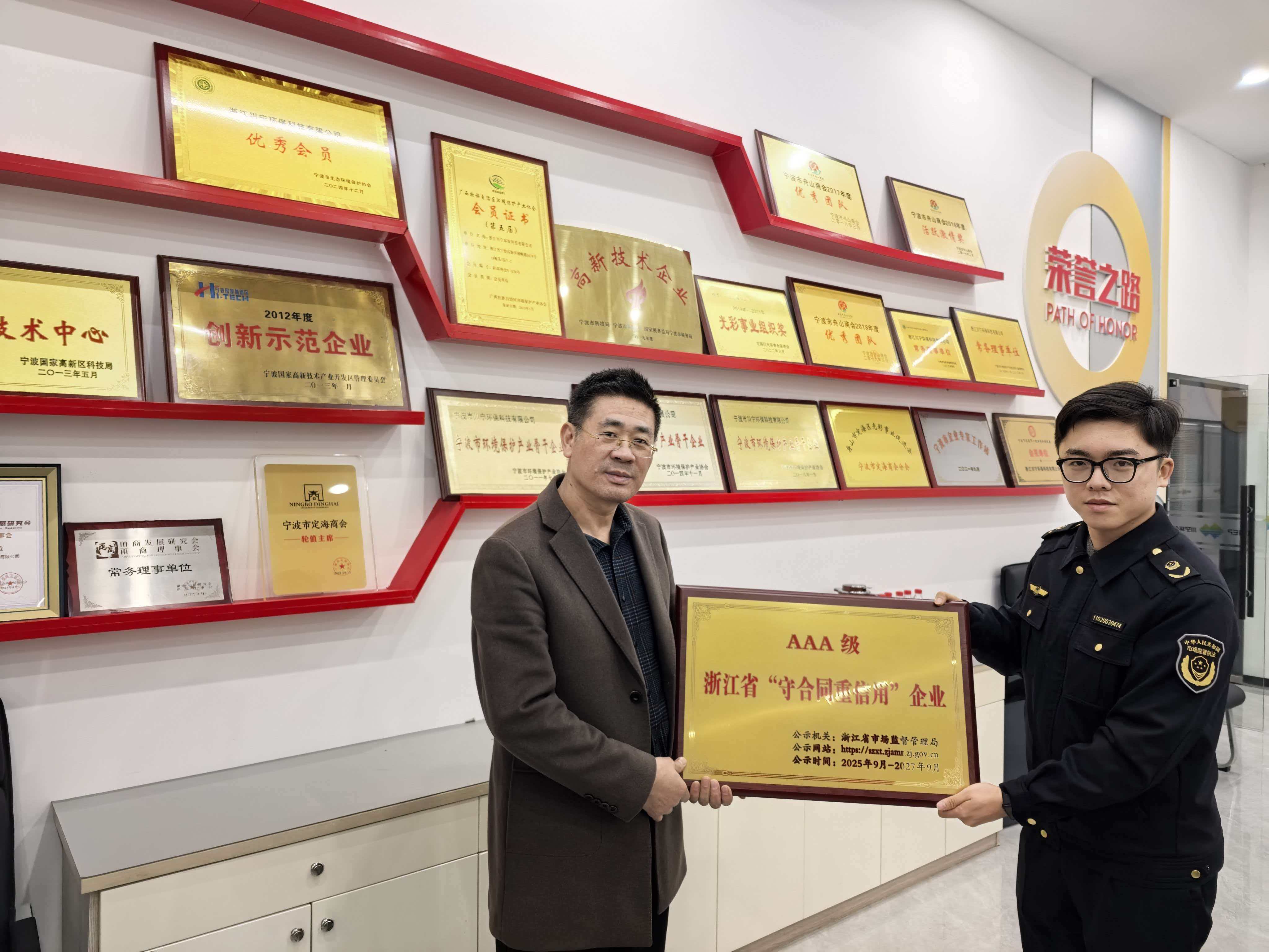 12月24日,寧波市高新區(qū)市場監(jiān)督管理局領(lǐng)導蒞臨浙江川寧環(huán)??萍加邢薰荆蛭宜绢C發(fā)—浙江省AAA級“守合同重信用”榮譽牌匾。
